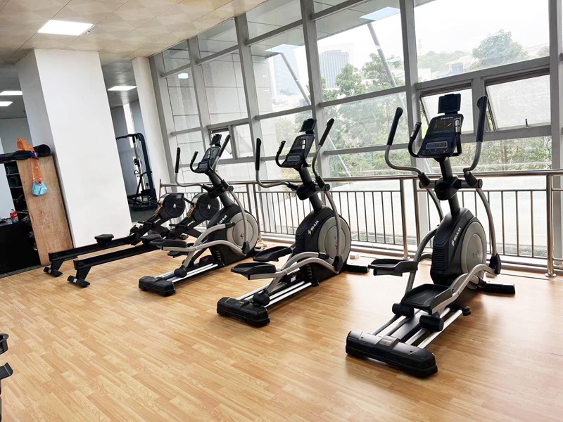 企事业单位健身房面积约为240平方,在接到客户项目需求时,我们根据客户的需求及预算,从装修布局、科学分区、合理的器材搭配等方面,为其提供了一站式健身解决方案。有氧区域配置jiuyou.comV9跑步机、X5跑步机,X5-E智能椭圆机、动感单车、划船器等有氧训练器材,有效锻炼提升人体心肺功能。