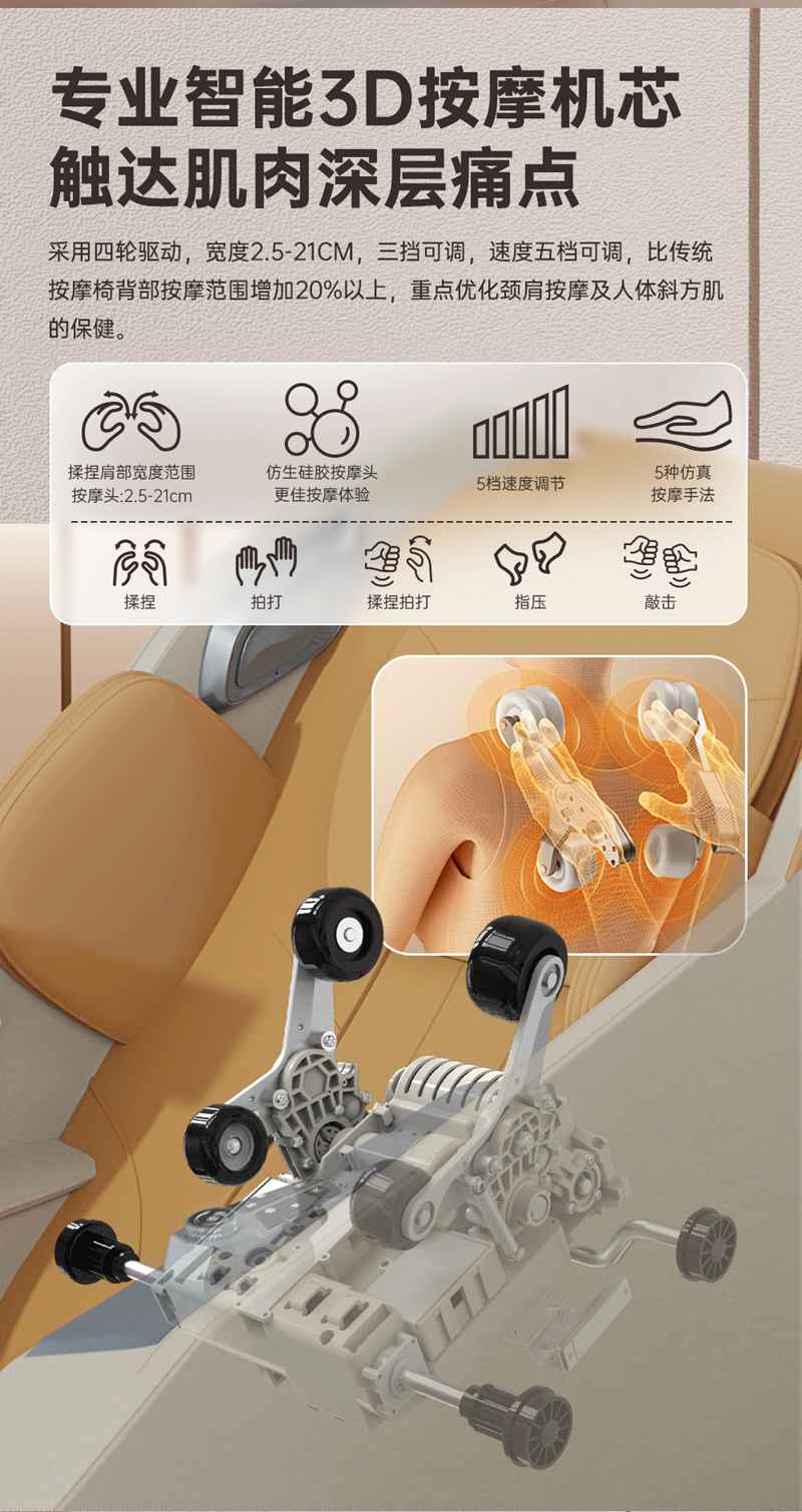 SH-M650 运动放松椅-4种运动放松特定程序,满足不同人群和场景下的需求,12种按摩程序,融合现代科技与传统按摩理念,提供精准力度和科学手法。定制135cmSL贴合7大部位27个点位,确保按摩全面深入,SL型导轨贴合人体背部曲线,提供精准舒适的按摩体验,双曲线导轨,高硬度,稳固不易变形。采用霍尔检测技术,通过多组传感器自动识别人体曲线和按摩点,机械手自动调节,适应不同身高体型,实现个性化按摩体验。