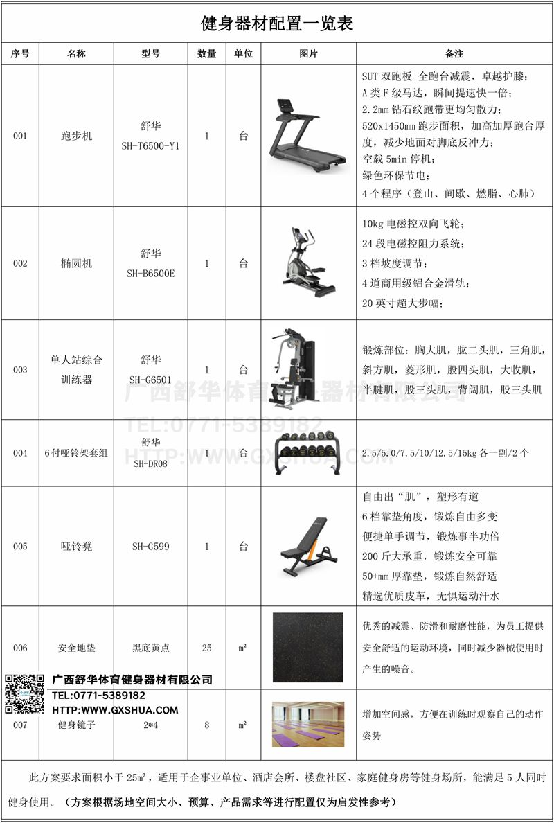 此方案要求面积小于25m²,适用于企事业单位、酒店会所、楼盘社区、家庭健身房等健身场所,能满足5人同时健身使用。(方案根据场地空间大小、预算、产品需求等进行配置仅为启发性参考)