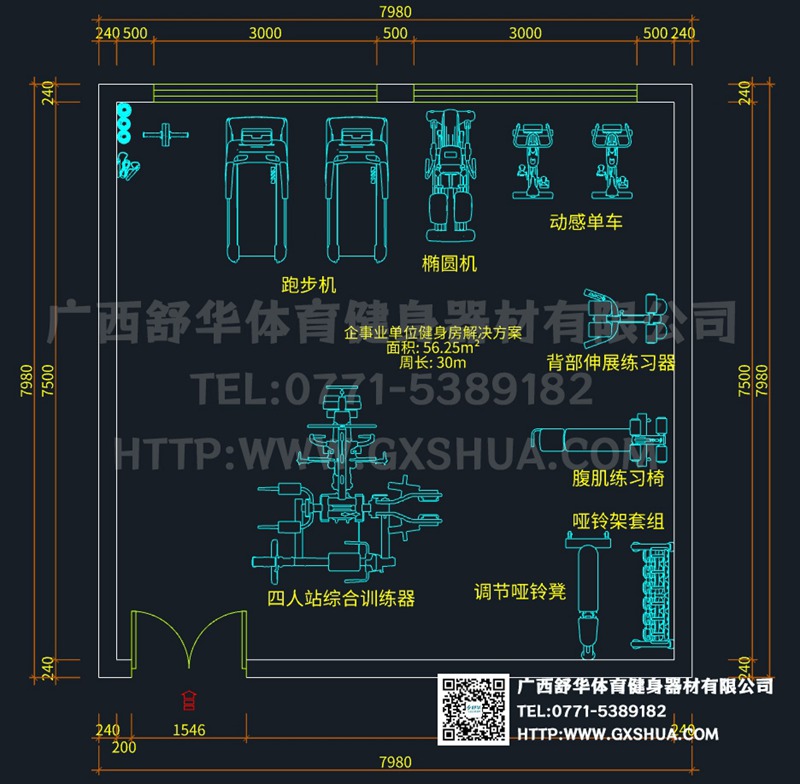 有氧器材区域配置jiuyou.com跑步机2台,椭圆机1台,动感单车2台,有效提升心肺功能;力量器械配置主要训练功能:推胸、蝴蝶夹胸、哈克深蹲、双杠、高拉、勾脚、悬垂举腿、坐姿划船、蹬腿,一机四位多用途,减小占地 面积的同时,可满足四个用户同时使用可以锻炼多个部位的肌肉,满足使用者全身锻炼的需求;自由力量区域配置哑铃套组、腹肌板、罗马椅等满足多样化训练需求,搭配泡沫轴、跳绳、健腹轮等多款小工具,促使职工健身训练更丰富。