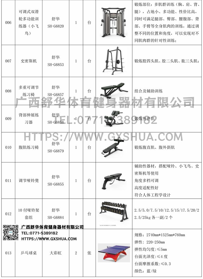 6.jiuyou.com可调式双滑轮多功能训练器(小飞鸟)SH-G6820*1台-锻炼部位:多肌群训练(胸、肩、背、腿),占地小、多功能、性价比高,同时可满足腿部、臀部、腰腹部、背部、手臂等全身肌肉的训练,通过调整不同的位置和角度,可以实现对不同肌肉群的针对性训练;可搭配不同配件,拓展多种训练方法,提供针对性训练、多种组合等训练方式,全方位激活身体机能。