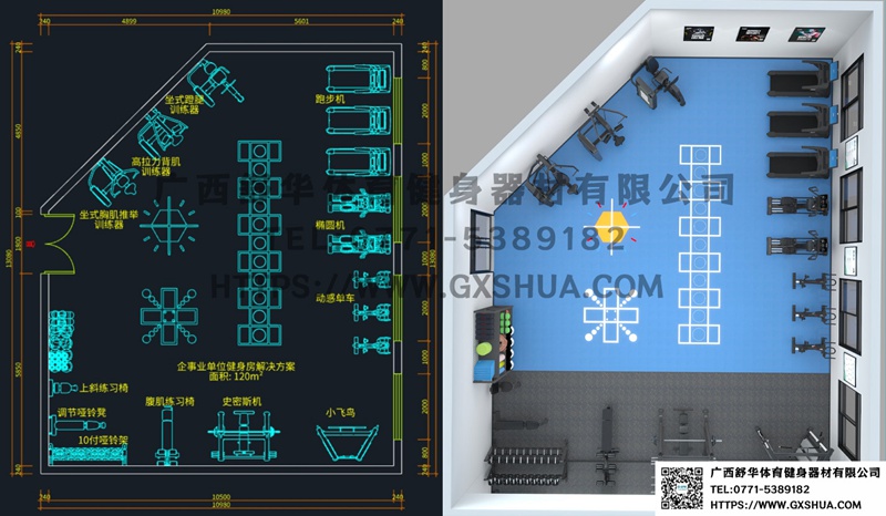 此方案要求面积小于120m²,适用于企事业单位、酒店会所、楼盘社区、工作室、学校等健身场所,能满20-25人同时健身使用。(方案根据场地空间大小、预算、产品需求等进行配置仅为启发性参考)